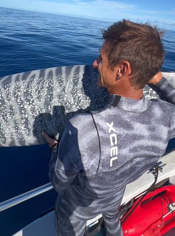Para não se tornar um “alvo fácil”, o mergulhador adaptou prancha e trajes com padrões inspirados em outro predador do mar, aplicando listras que remetem ao tubarão-tigre. O efeito visual funciona como um recurso de camuflagem, passando ao animal a ideia de que aquele corpo não é uma presa comum.