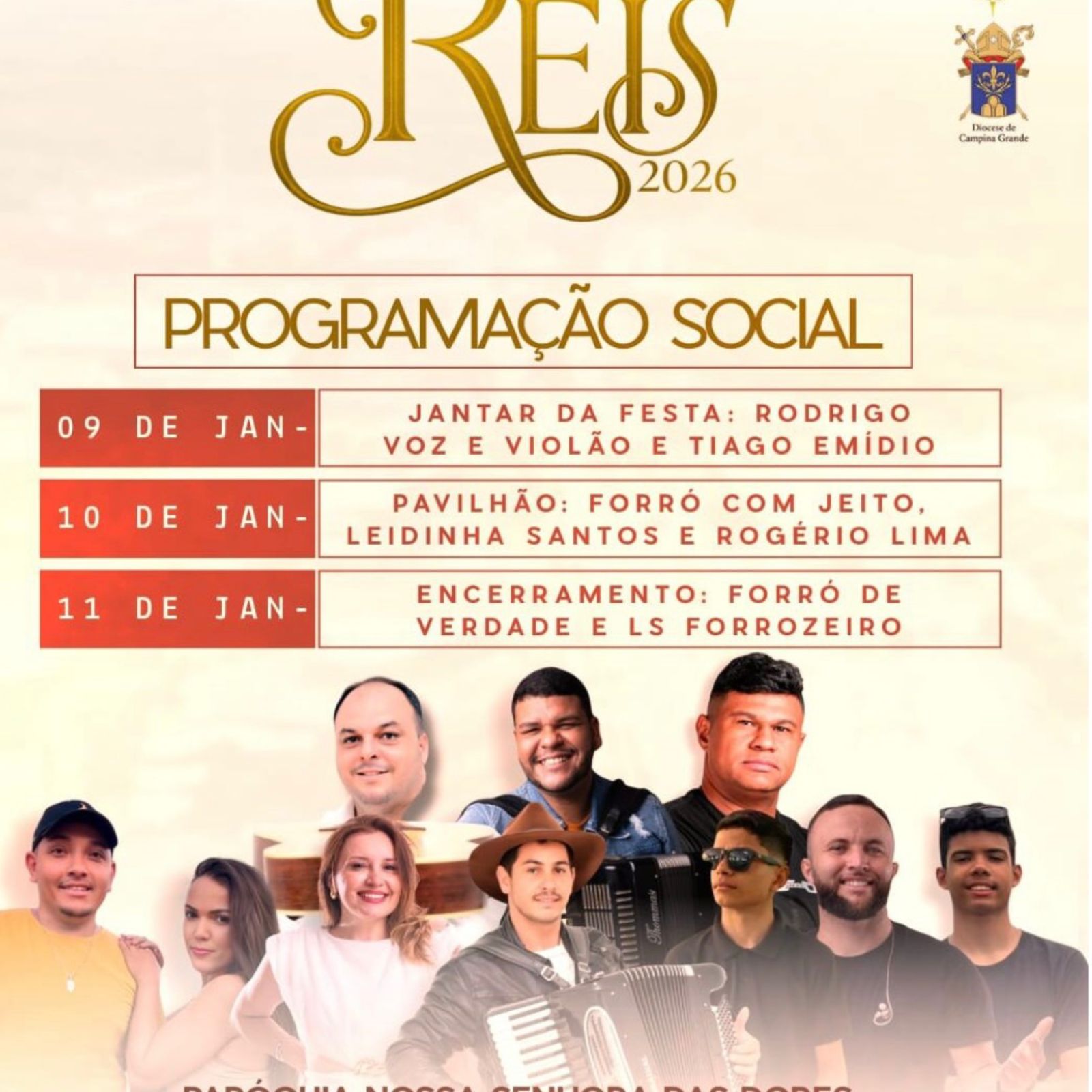 O encerramento da programação social ocorre no sábado, 11 de janeiro, com apresentações de Forró de Verdade e LS Forrozeiro, fechando a Festa de Santos Reis 2026 em clima de alegria, tradição e celebração popular.