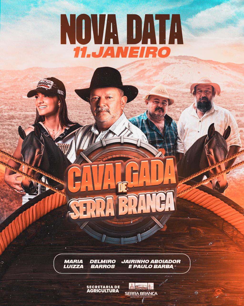 A Prefeitura Municipal de Serra Branca anunciou oficialmente a nova data da 1ª Cavalgada de Serra Branca, que será realizada no dia 11 de janeiro. O evento promete se tornar uma das maiores expressões de fé, cultura e tradição do município, ganhando ainda mais destaque já em sua estreia com a confirmação do renomado artista Delmiro Barros como atração principal.