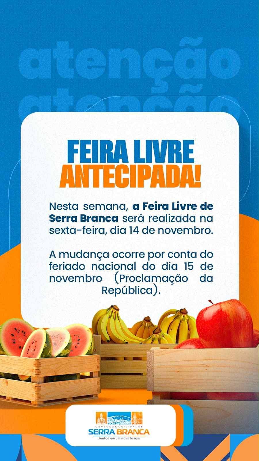 A Prefeitura Municipal de Serra Branca informa que, excepcionalmente nesta semana, a Feira Livre Municipal será antecipada para a sexta-feira, dia 14 de novembro, em virtude do feriado nacional da Proclamação da República, comemorado no sábado, dia 15 de novembro.