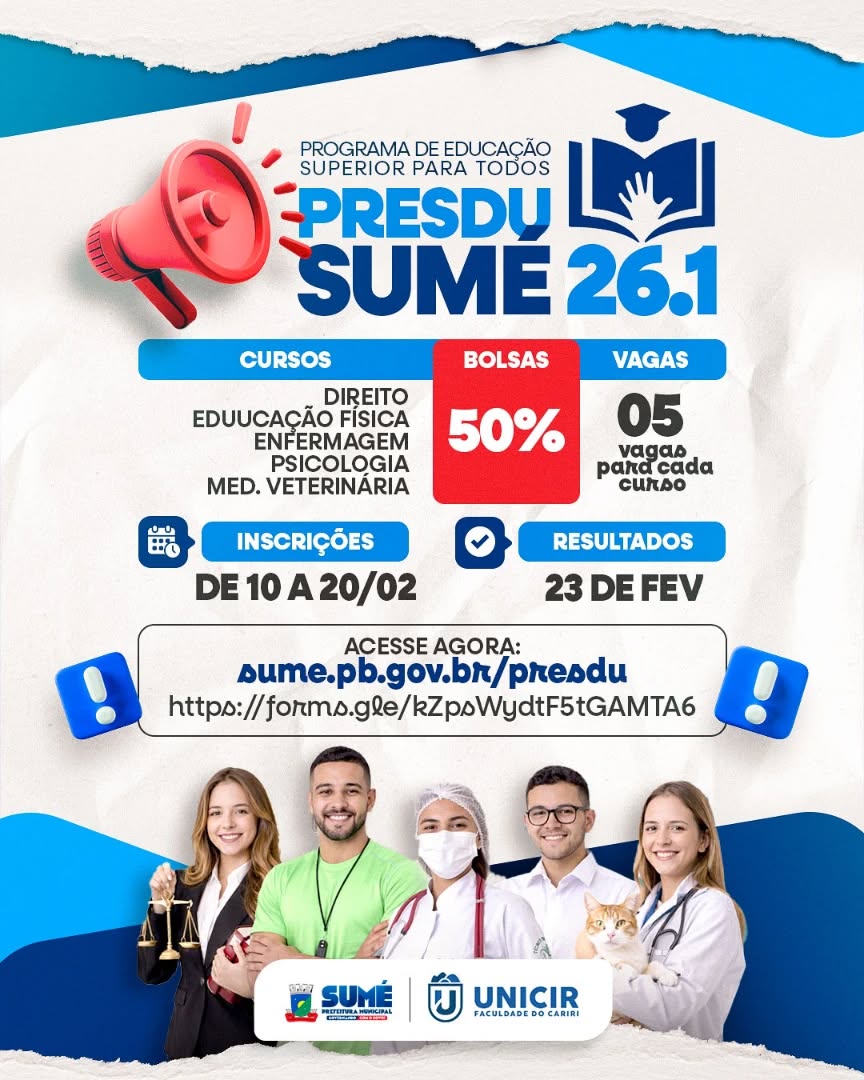 Confira mais informações: Edital n° 01 – PRESDU_PREFEITURA SUMÉ-UNICIR – 2026.1