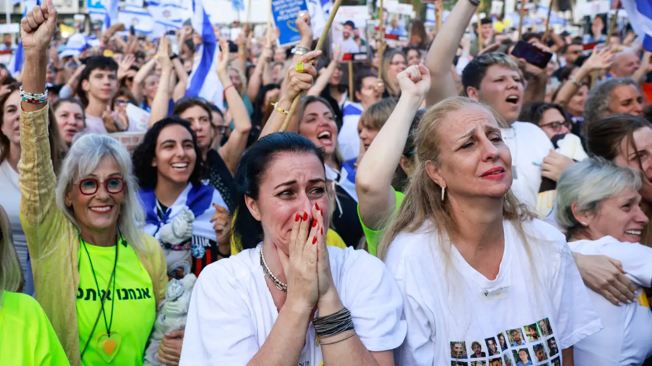 Enquanto as famílias dos reféns libertos assistiam, emocionadas, às imagens de seus filhos sendo entregues pela Cruz Vermelha aos militares das IDF, uma multidão de cerca de 65 mil pessoas acompanhou o momento por telões na Praça dos Reféns, em Tel Aviv, e explodiu em comemoração com a notícia da libertação.