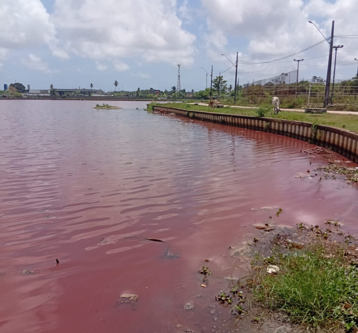 Durante vistoria técnica, realizada nesta quinta-feira (28), os fiscais identificaram alteração significativa na coloração da água, com tonalidade avermelhada, além de forte odor característico de esgoto, presença de material oleoso nas margens e resíduos sólidos dispersos. Também foi observada uma tubulação direcionada para a lagoa, com indícios de transporte de efluentes, oriunda da área onde estão instalados estabelecimentos industriais no entorno.
